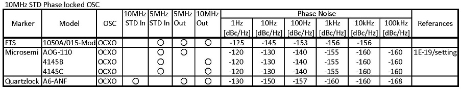 - 上記の条件を満足する調査した限りとなる現在入手出来ます低位相雑音のRb-OSCは、Quartzlock社製のA1000-Op-C、A1000A-Op3、E10LN-Op3、A10-M-Op-Dの1社4製品のみです。不思議な事にこれ等の製品を具体的に表示し説明した記事等は、現在迄に全く存在しません。