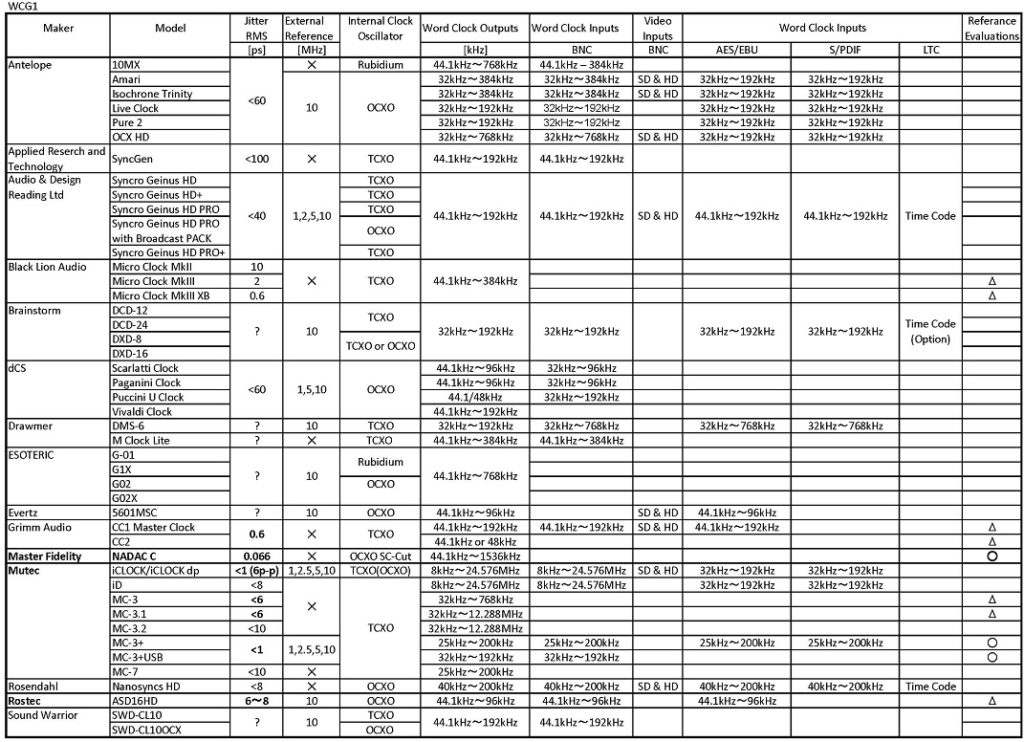 - ワードクロックの重要な事は、ジッターが7ps未満で且つ、10MHz標準周波数入力がある製品の選択が望ましい事です。これは、SNRに直接関連すると同時に良い音にする為にも必要な事項です。