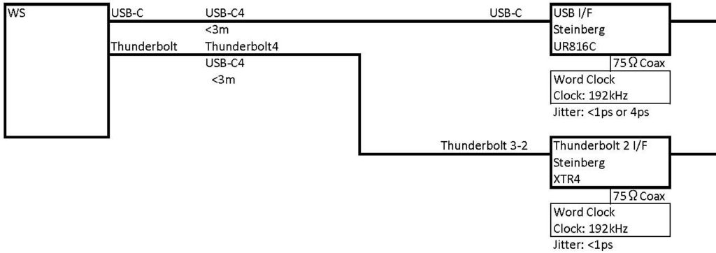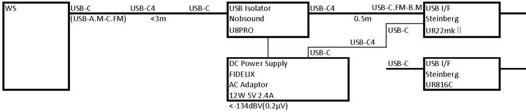 - USBオーディオインターフェースへの、USB-C4ケーブルからBオスコネクター変換の長さは、0.5mにします。