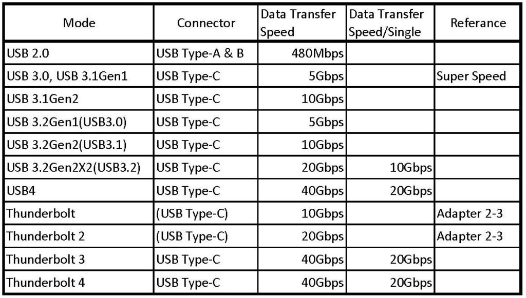 - USBのタイプ別伝送速度とコネクター形式について、下記の表を参照してください。